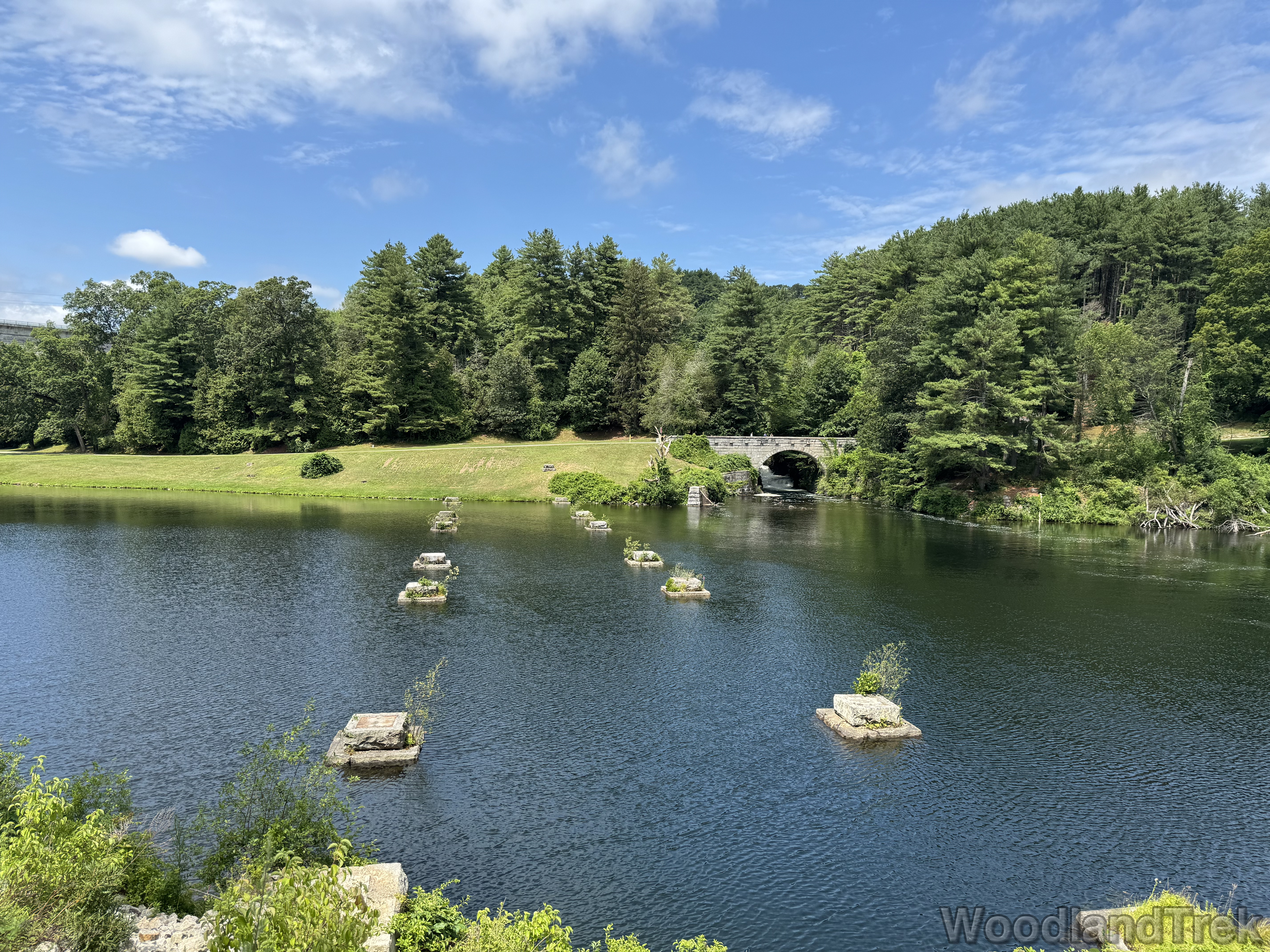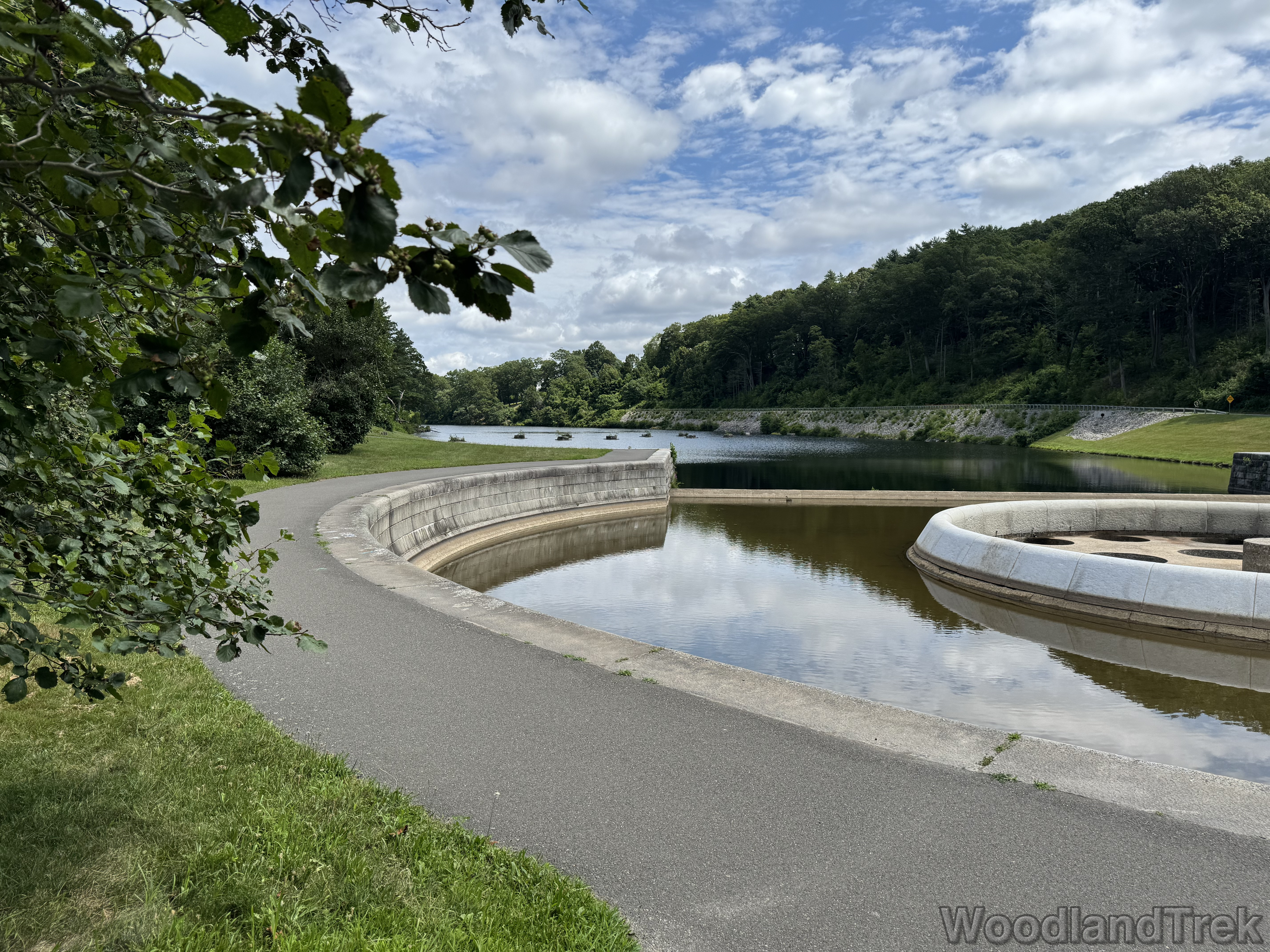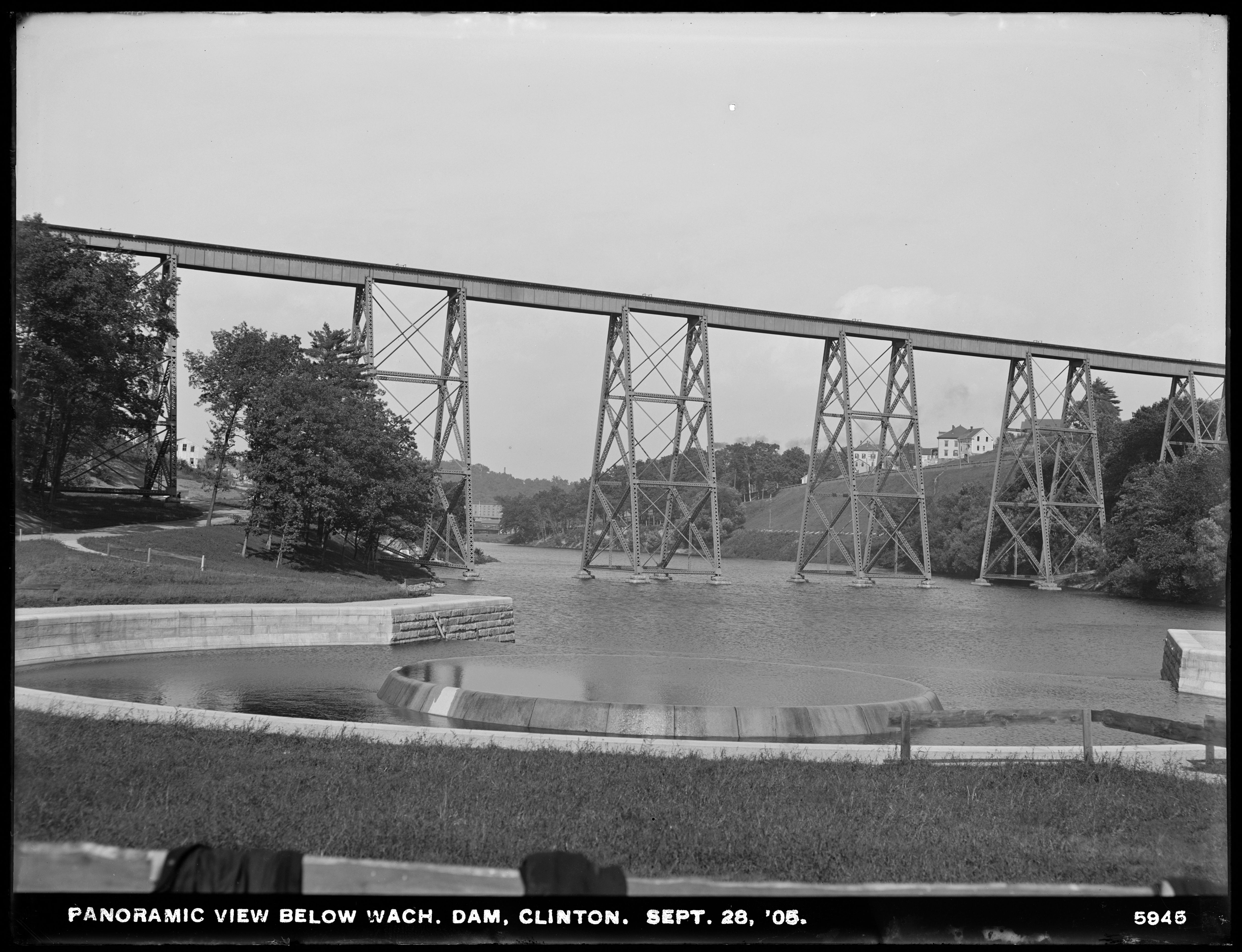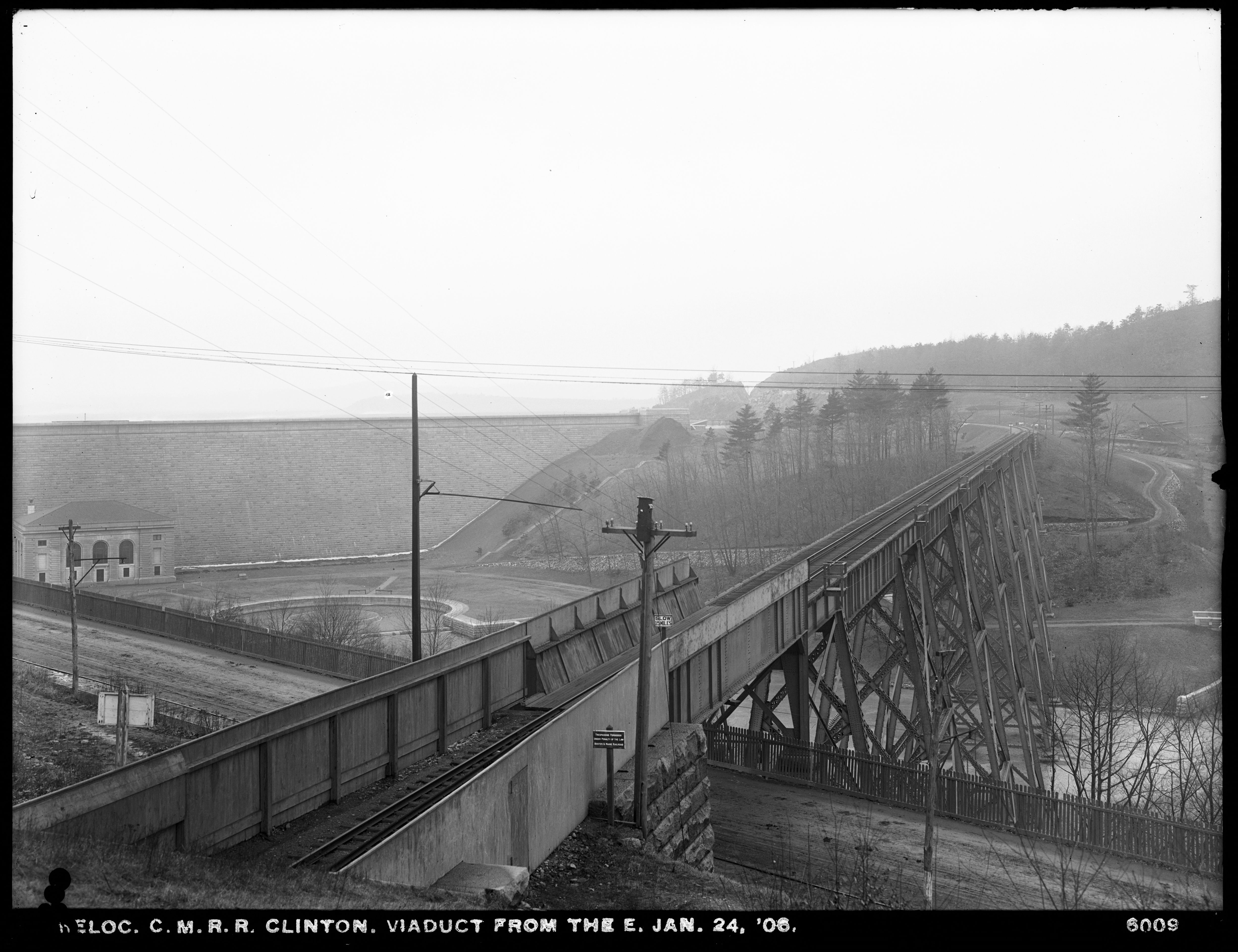 All that remains of the viaduct at the Wachusett Dam are the footings in the water, as seen in my photos from 2025. (Album: 2025-07-13) The black and white photos dated 1905 and 1906 show the structure that once stood. The viaduct was removed in 1975.